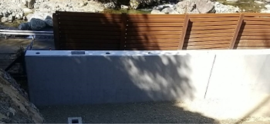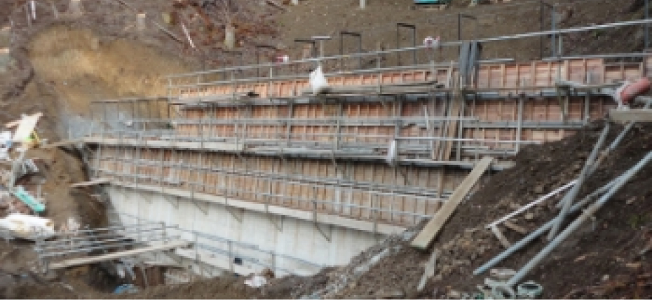 山から土砂や倒木が道路に出ないように、コンクリートの擁壁や落下防止柵を作ります。