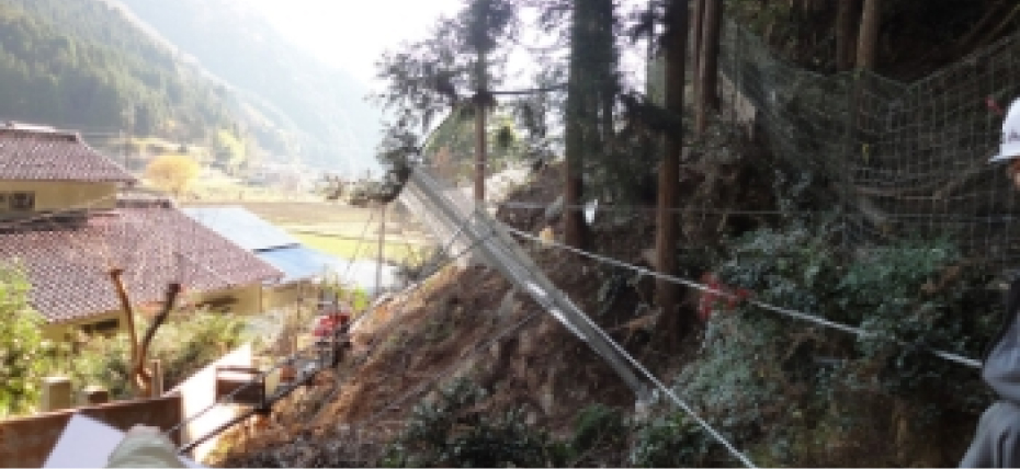 ワイヤロープと金網のネットで、落石の危険性のある斜面を完全に覆います。
